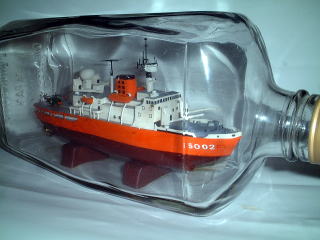同率縮尺では見栄えがしないので特徴を捉えデフォルメするのがコツ。 艦橋の窓枠が大きすぎたため艦が小さく見える。 取出して手直しが効かないだけに反省 |