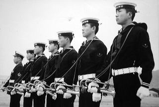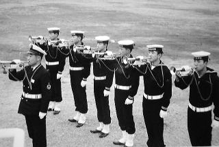 | その2 教育が始まって間も無く課業整列の際、「ラッパの吹ける者列外」との令がかかり高校時代に吹奏楽部に在籍していた私と数名が申し出て「ならば一曲吹いてみろ」と言うことで「君が代」と「食事」を吹奏したら即合格となる。かくしてラッパ隊が編成され修業まで続けられるのである。修業後音楽隊に勤務して生涯をラッパ一筋の奴もいたなー。 |