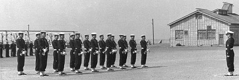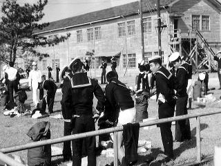 その1 ”少数の中から多数選ばれ”晴れて84期練習員となる。いわゆる”官品”の制服受領風景。男所帯だけに野外での試着もお構いなし。補給担当の海曹の第一声が「制服に身体を合せるんだぞ!」に全員沈黙!?何のことはない自衛隊の制服は規格・号数が決られているのである。一端の水兵気分で敬礼なんかしている奴もいる。S.41当時は旧海軍武山海兵団の木造隊舎が現存していた。 |