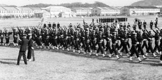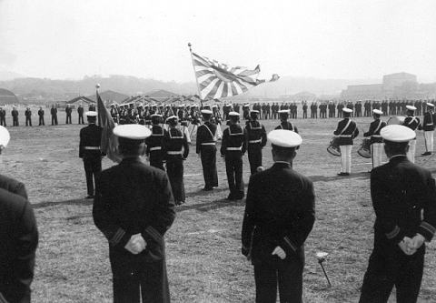 | ああ堂々?の観閲行進 背景は旧海兵団隊舎、陸自・空自・少年工科学校などが混屯の大所帯 朝の体操後の駆け足で陸の駆け足集団と正面からぶつかりあったが防大出の分隊士の「絶対に避けるな退くな」の令により針路速力そのままを保持。 シーマンシップのひとつ敗けじ魂は、こうして培われていくのかな。 |