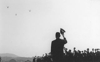 館山航空隊から飛来した祝賀飛行へりに帽振れ 以後出港・卒業・転勤・退職の度、頻繁にこの儀礼を体験することになる。 |