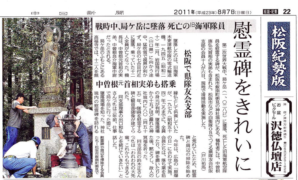 ■昭和20年2月28日木更津発岩国向け飛行中の海軍零式輸送機が折からの猛吹雪で視界を失い、同寺左の局ヶ岳に墜落乗員12名が戦死