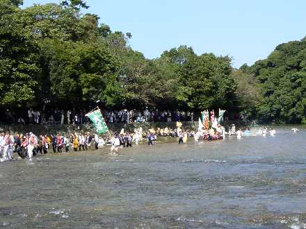 伊勢神宮の神嘗祭 初穂曳 例年、内宮では10月16日に今年収穫した 稲穂を舟に積んで、五十鈴川を宇治橋ま でのぼります。 |