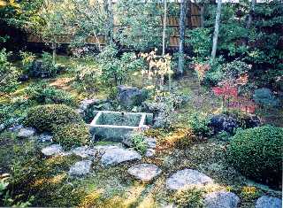 この庭園は、養和元年(1181)上賀茂神社の 中央に見えている石が降臨石を形取り、その前は「曲水の宴」のための小川になっています。 |