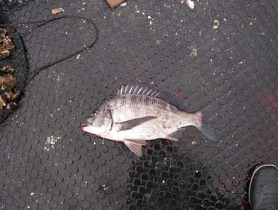 右が早朝2投目のボケ餌にきた45cm。左は午後3時半、カキの半貝に食ってきた54cmの良型チヌ