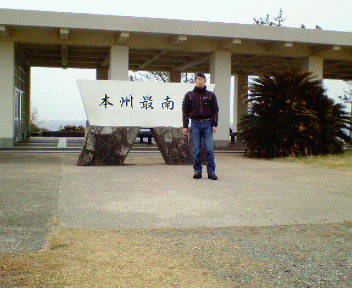 いそいで本州最南端の碑前にて記念撮影。セローと一緒に写りたかった・・・。最南端到達証明書とかまだ売ってるのでしょうか?展望台ではおじさんが地図を広げながら海を見ていました。とにかくささっと岬だけみてから、トイレだけすませて、帰路へ。岬を見ているくらいから少し、空が白くなってきました。今のとこ雨は大丈夫そうです。時計は10時40分です。予定より40分オーバー。