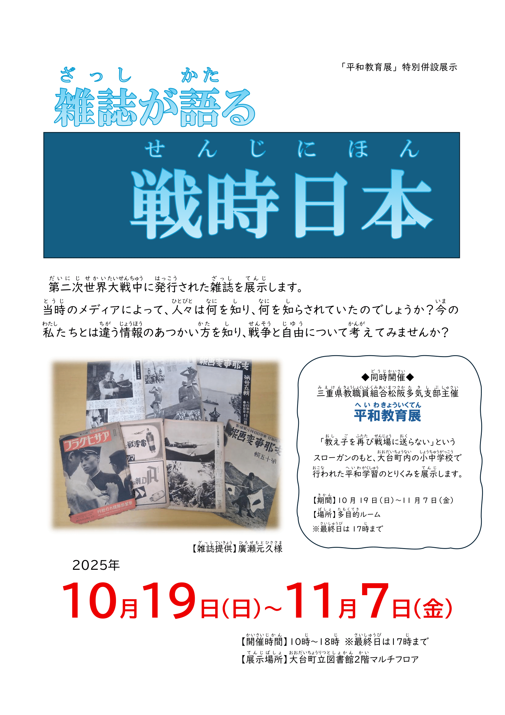 | 「平和教育展」特別併設展示【雑誌が語る戦時日本】開催! 第二次世界大戦中に発行された雑誌を展示します。 当時のメディアによって、人々は何を知り、何を知らされていたのでしょうか? 今の私たちとは違う情報のあつかい方を知り、戦争と自由について考えてみませんか? 同時開催の三重県教職員組合松阪多気支部主催「平和教育展」もぜひご覧ください! 〔開催期間〕10月19日(日)〜11月7日(金) 〔開催時間〕10時〜18時 ※最終日は17時まで 〔展示場所〕図書館 2階 マルチフロア |
