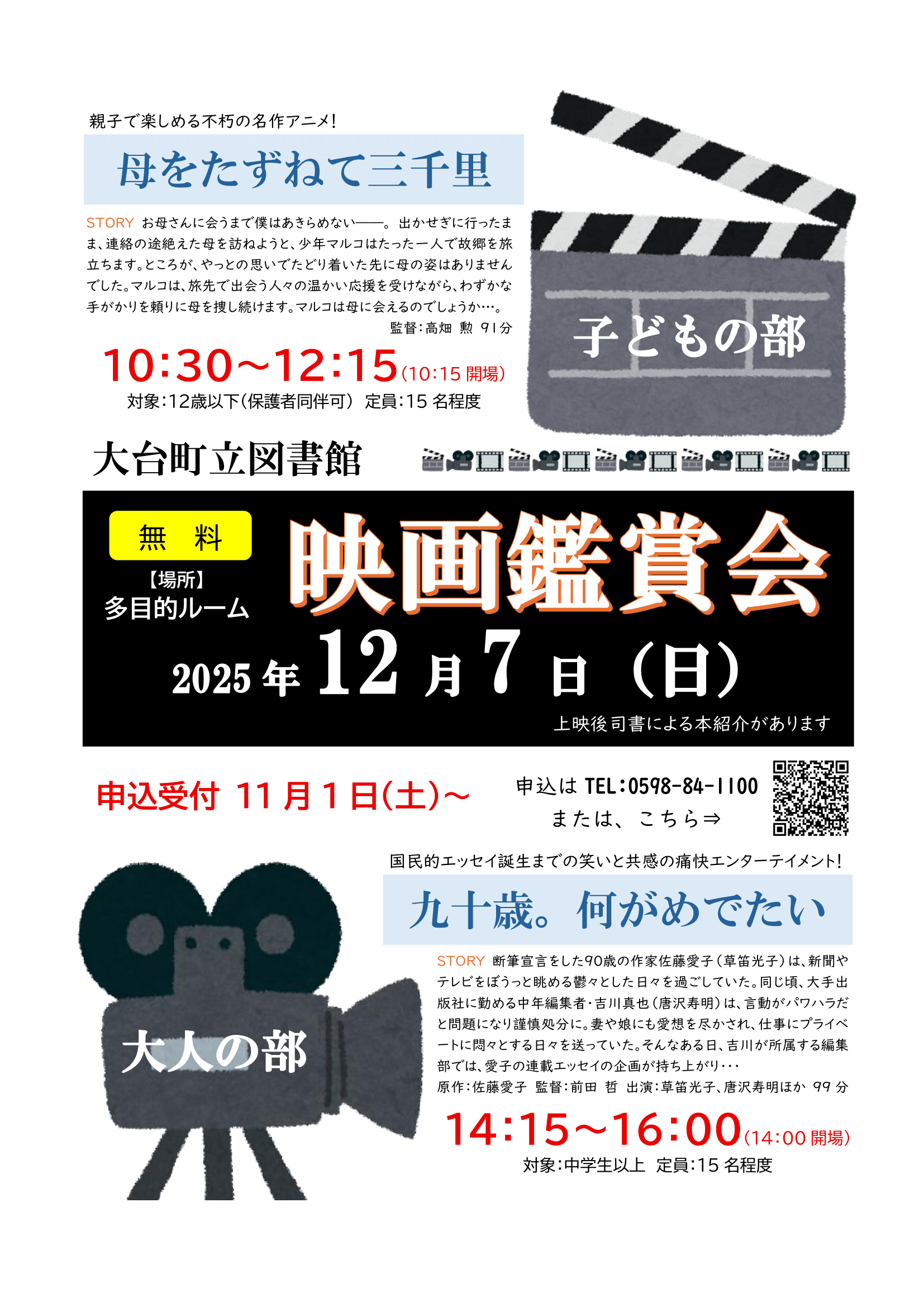 | 【映画観賞会 開催!】 図書館で映画観賞会を開催します。ぜひお越しください。 〔日 付〕12月7日(日) 〔内 容〕子どもの部:「母をたずねて三千里」10:30〜12:15(10:15開場) 対象 12歳以下(保護者同伴可) 定員 15名程度 大人の部:「九十歳。何がめでたい」14:15〜16:00(14:00開場) 対象 中学生以上 定員 15名程度 〔場 所〕2階 多目的ルーム 〔申 込〕受付または電話(84-1100)またはWeb(Web申し込みはコチラ) |