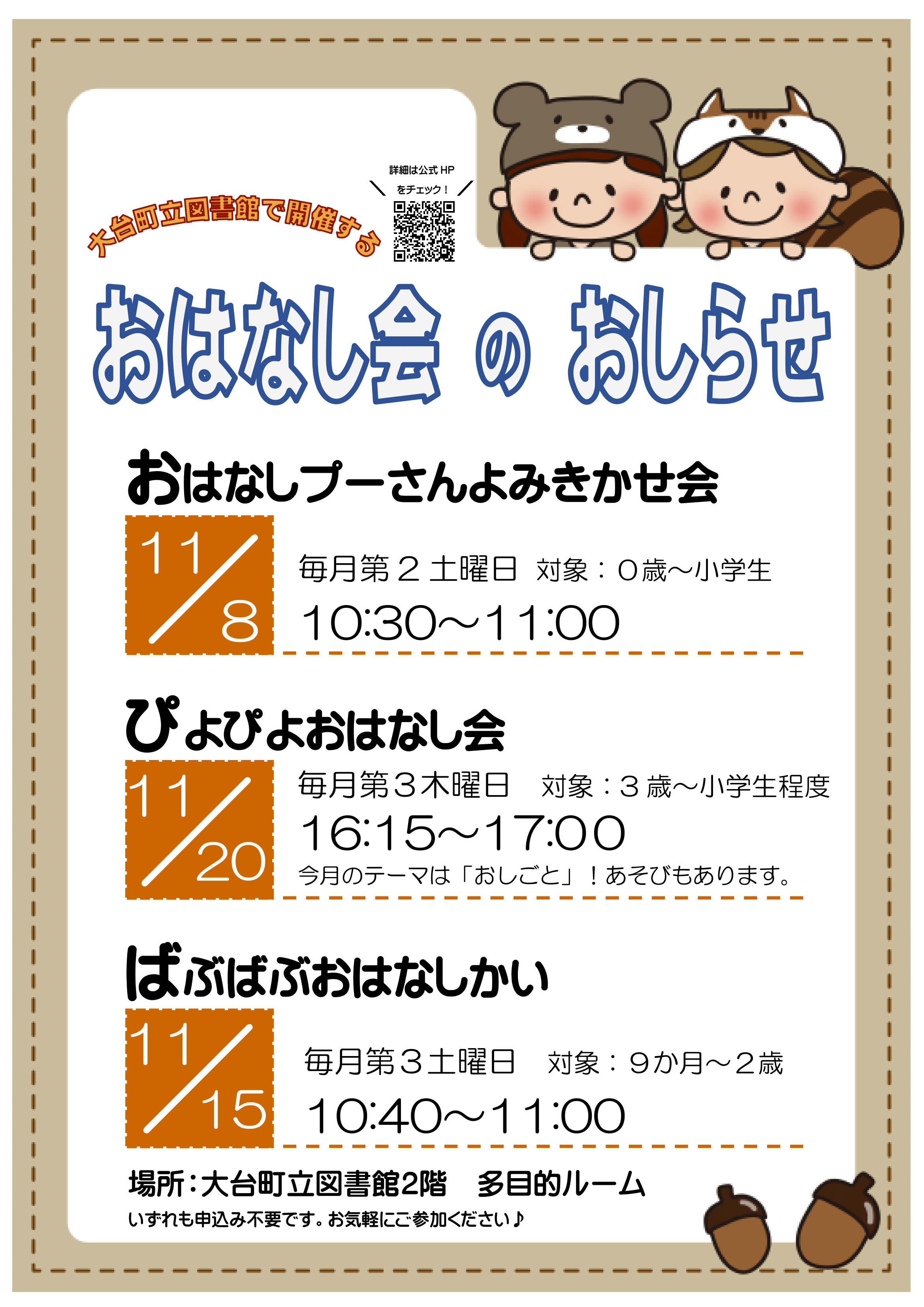 | おはなしプーさん 読み聞かせ会 ボランティアグループ「おはなしプーさん」による読み聞かせ会です。 毎月第2土曜日に開催しています。 〔日 時〕11月8日(土)10:30〜11:00 〔場 所〕2階 多目的ルーム ぴよぴよおはなし会 司書による絵本の読み聞かせ会です。 毎月第3木曜日に開催しています。 11月のテーマは「おしごと」♪ ちょっとした遊びもします。ぜひお越しください。 〔日 時〕11月20日(木)16:15〜17:00 〔場 所〕2階 多目的ルーム ばぶばぶおはなしかい 9カ月〜2歳児を対象に絵本の読み聞かせと簡単な遊びをします。 毎月第3土曜日に開催しています。 お子様と一緒に楽しい時間を過ごしませんか? 兄弟、姉妹で参加OK!気軽にお越しください。 〔日 時〕11月15日(土)10:40〜11:00 〔場 所〕2階 多目的ルーム |