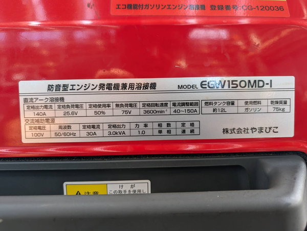 ガソリン, 溶接1人, 溶接棒2-3.2mm, 発電100V*2, 重量75kg