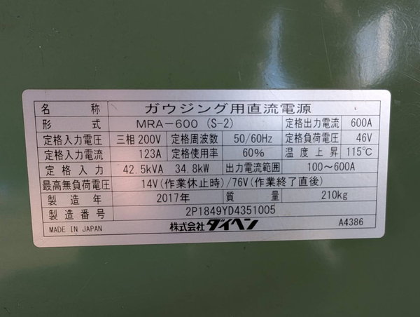 ガウジング専用機600A ダイヘン